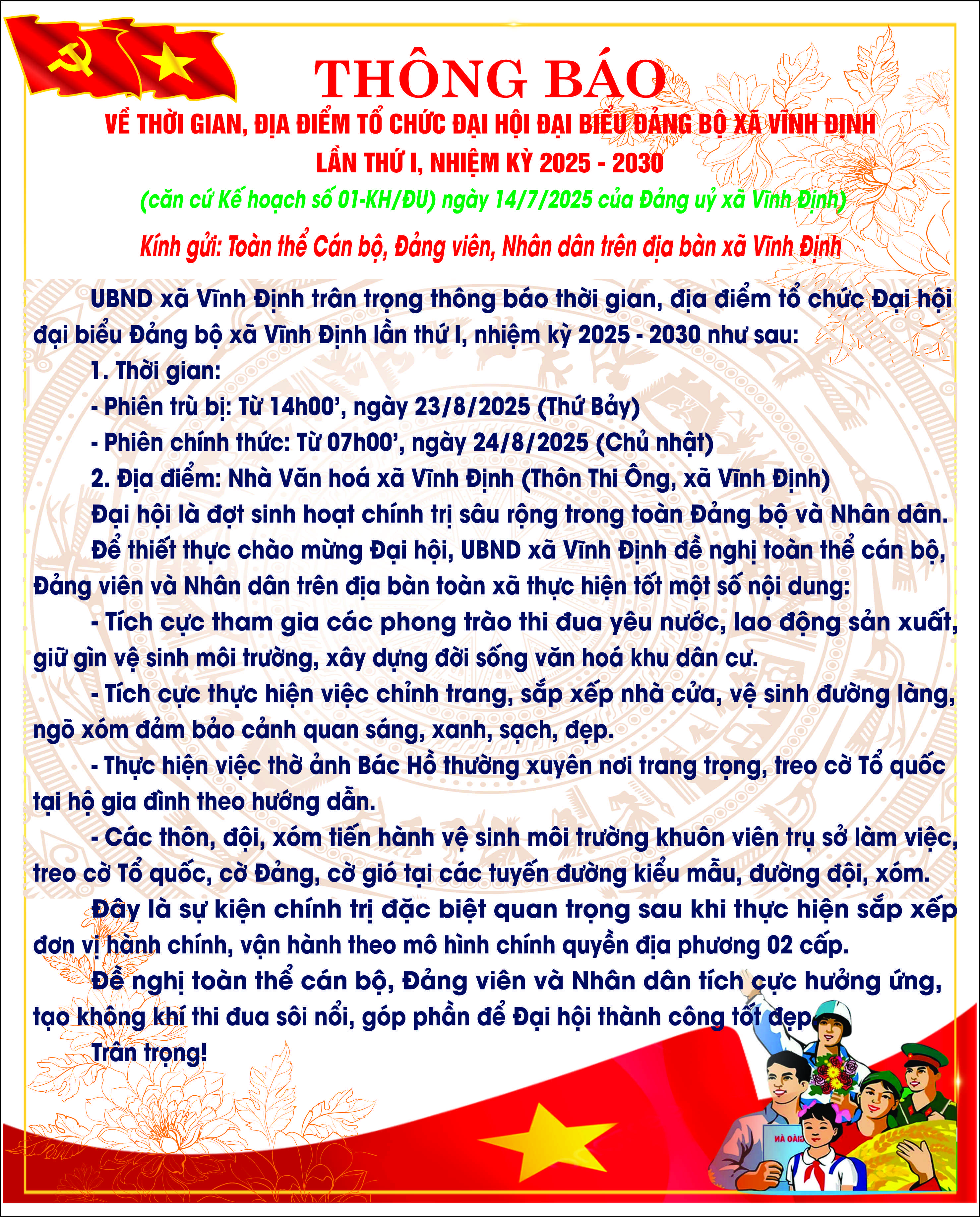THÔNG BÁO VỀ THỜI GIAN, ĐỊA ĐIỂM TỔ CHỨC ĐẠI HỘI ĐẢNG BỘ XÃ VĨNH ĐỊNH LẦN THỨ I, NHIỆM KỲ 2025 - 2030